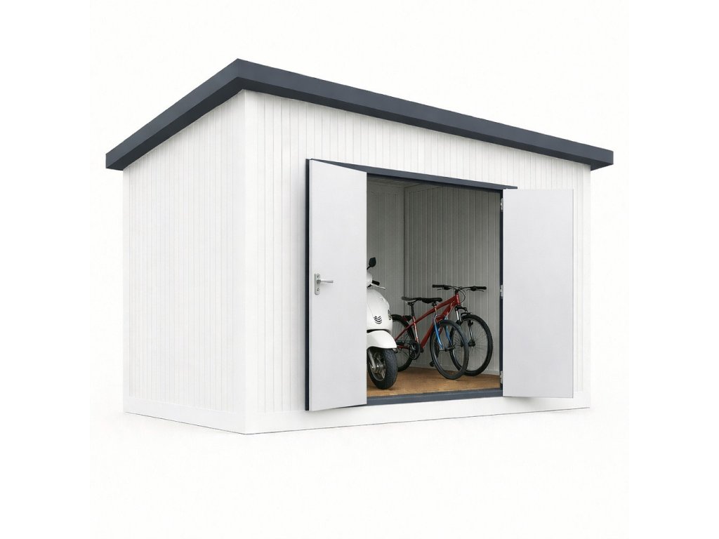 Vnitřní prostor je navržen jako praktická mini garáž, do které se pohodlně vejde skútr nebo motorka spolu s jízdními koly. Stabilní vnitřní klima chrání techniku před vlhkostí, kondenzací a výkyvy teplot, což je zásadní rozdíl oproti běžným nezatepleným stavbám.