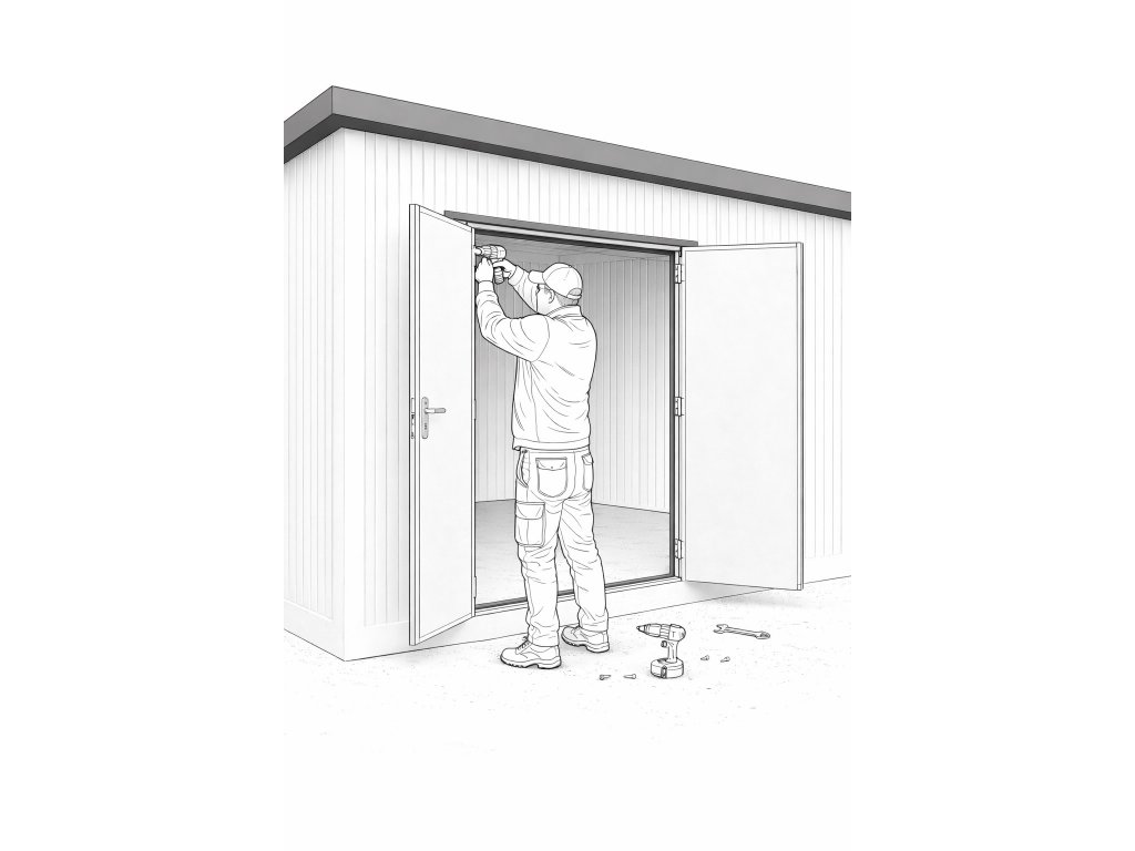 Vstup do objektu zajišťují izolované dvoukřídlové plechové dveře, které se otevírají dokorán každým křídlem zvlášť. Toto řešení umožňuje pohodlnou manipulaci s technikou, snadné zajíždění i maximální využití světlého otvoru bez omezení prostoru před garáží. Jednoduchý bílý vzhled doplněný antracitovým podbitím střechy působí čistě a nadčasově a snadno zapadne k rodinnému domu i moderní zástavbě.