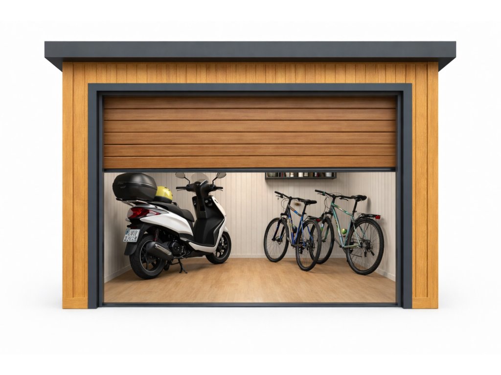 Vnitřní prostor je navržen jako praktická mini garáž, do které se pohodlně vejde skútr nebo motorka spolu s jízdními koly. Stabilní vnitřní klima chrání techniku před vlhkostí, kondenzací a výkyvy teplot, což je zásadní rozdíl oproti běžným nezatepleným stavbám.