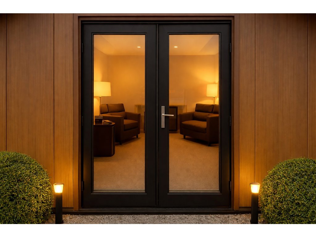Hliníkové prosklené dveře v antracitové barvě přivádějí do interiéru dostatek denního světla a podtrhují moderní architektonický vzhled domku. Díky dobrým izolačním vlastnostem je objekt vhodný pro celoroční využití a lze jej přizpůsobit na míru z hlediska rozměrů, barev i vybavení.