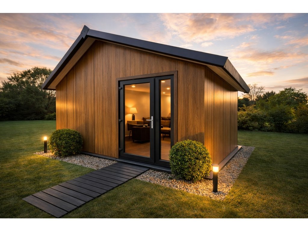 Domek je vyroben z moderních sendvičových izolačních panelů, které spojují nosnou konstrukci, tepelnou izolaci a finální povrch v jednom prvku. Vnější opláštění v dřevodekoru zajišťuje dlouhou životnost, barevnou stálost a odolnost vůči povětrnostním vlivům bez nutnosti nátěrů.