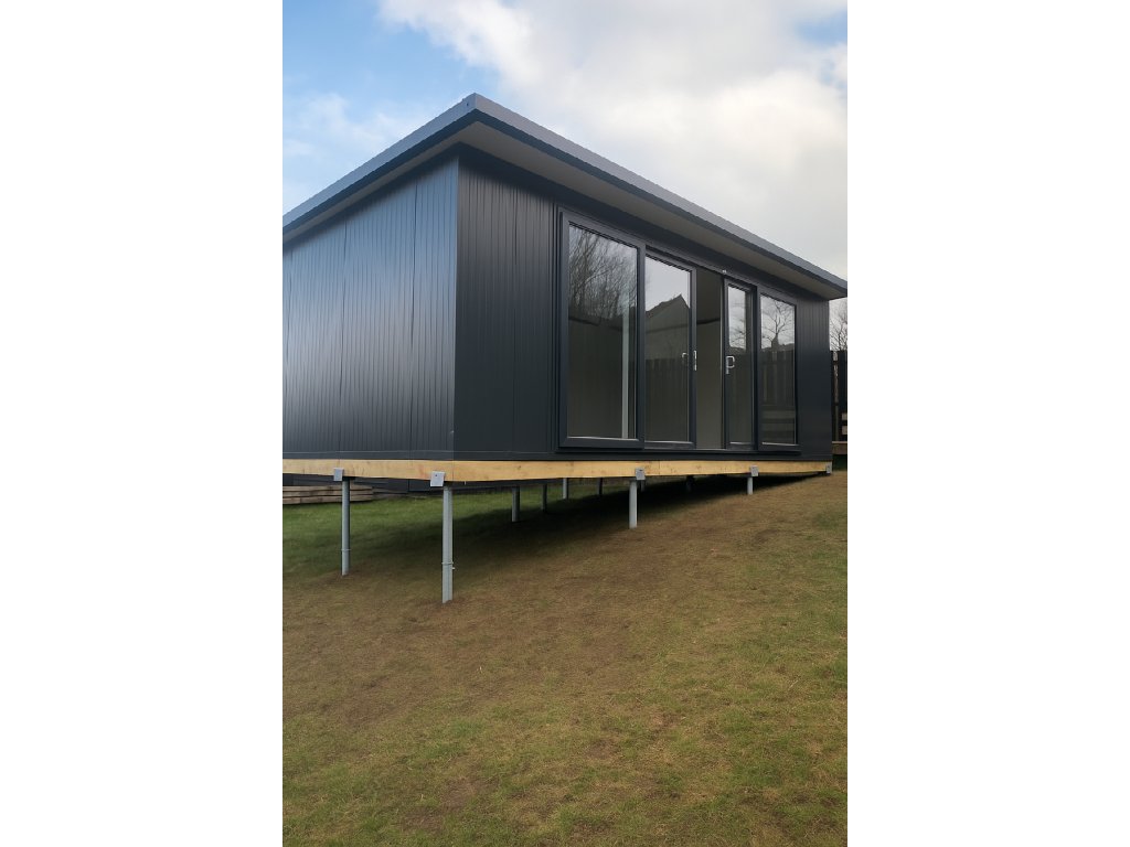 Prostorný montovaný domek v rozměru 6 × 3 m s velkoformátovým hliníkovým oknem 3000 × 2100 mm nabízí ještě více světla, prostoru a flexibility využití. Díky větší šířce prosklení působí interiér otevřeně a moderně, což z něj činí ideální řešení nejen pro kancelář, showroom, prodejní místo nebo zázemí pro podnikání, ale také pro soukromé využití u rodinného domu nebo na zahradě.