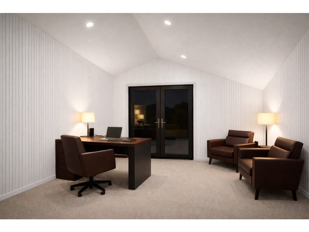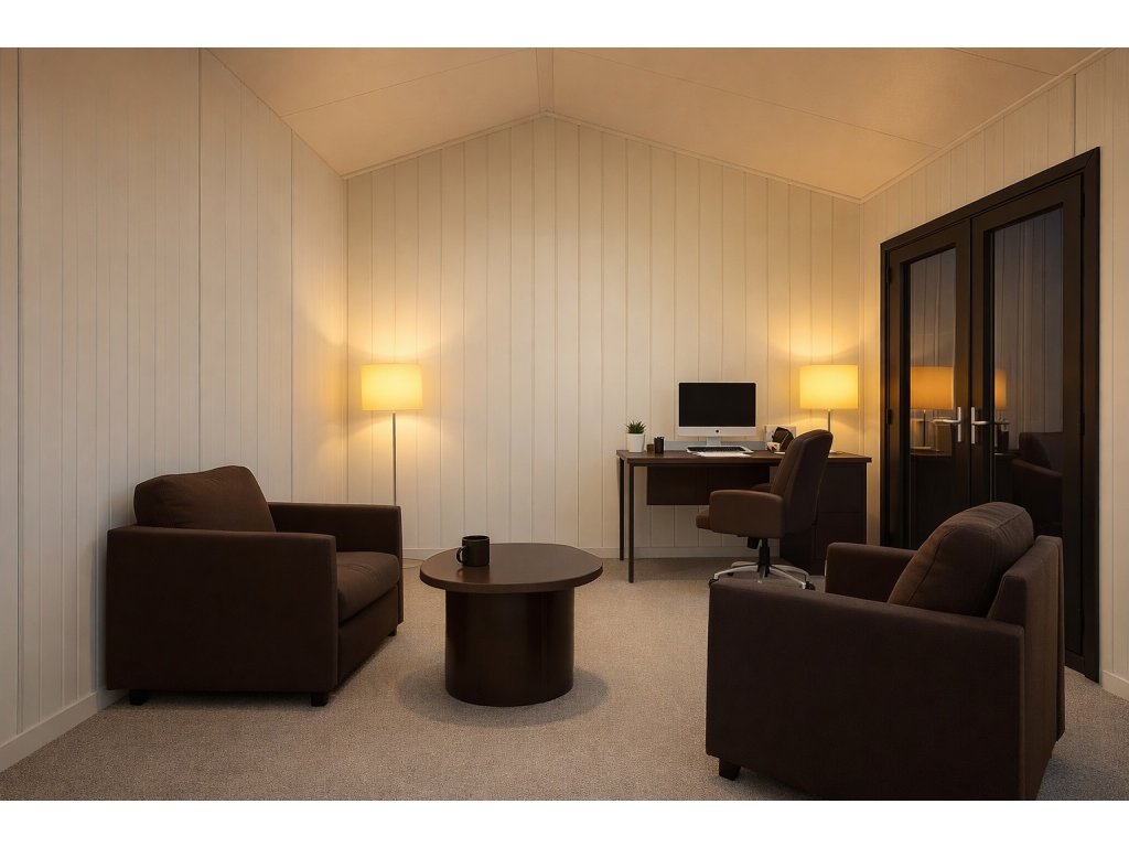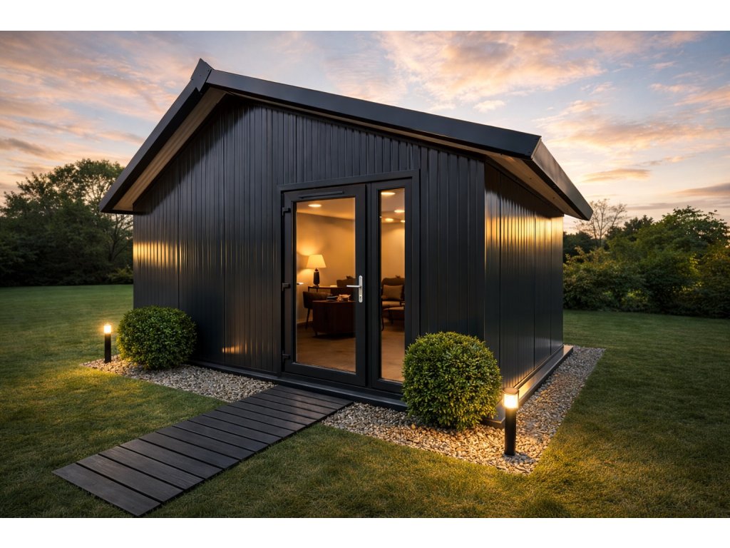 Minimalismus. Odolnost. Světlo. Tento montovaný domek v antracitovém provedení posouvá hranice modulární výstavby. Kombinuje čistý architektonický vzhled s precizním technickým řešením a vytváří prostor, který nepůsobí jako kompromis, ale jako plnohodnotná stavba pro náročné využití. Světlý interiér s bílými panely a velkým prosklením nabízí pocit vzdušnosti, klidu a moderní elegance.