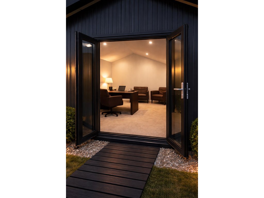 Hliníkové prosklené dveře v antracitovém provedení zajišťují dostatek světla a současně podtrhují moderní technický charakter stavby. Díky výborným izolačním vlastnostem je domek vhodný pro celoroční provoz. Objekt lze individuálně přizpůsobit z hlediska rozměrů, dispozice, barevného řešení i technického vybavení podle konkrétních požadavků.
