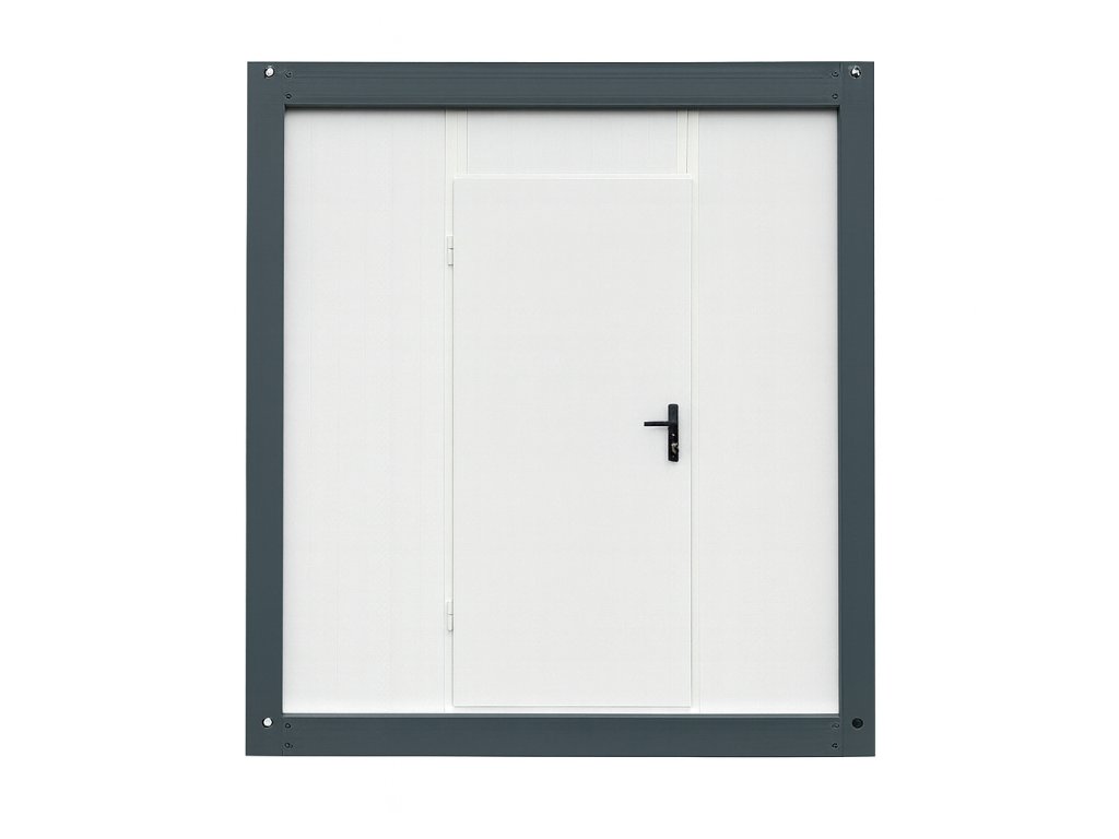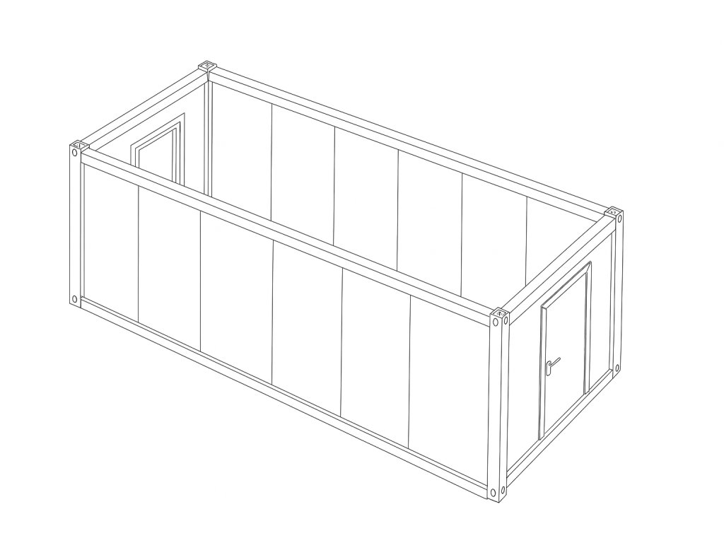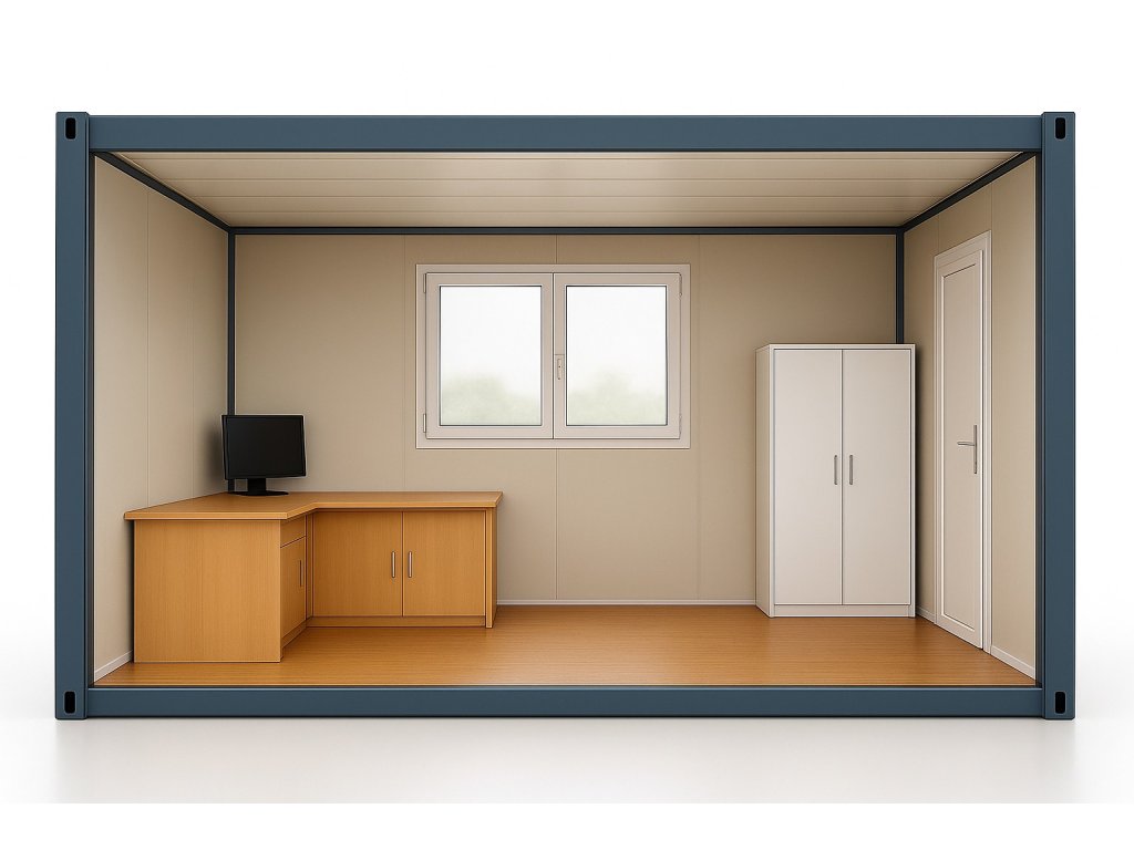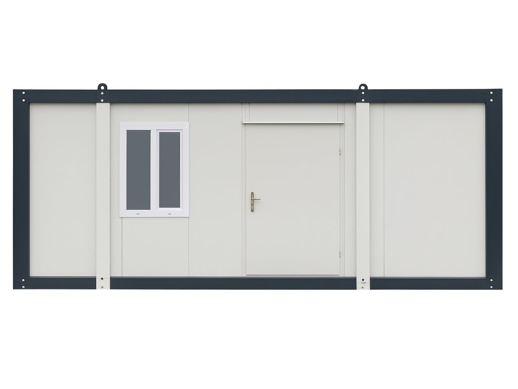 Základ tvoří ocelový rám ošetřený proti korozi v odstínu RAL 7016 (antracit). Stěny jsou vyrobeny ze sendvičových panelů RAL 9002 (šedobílá) s tepelnou izolací, což umožňuje využití kontejneru po celý rok. Střešní i podlahové části jsou rovněž zateplené a uzpůsobené pro pohodlný provoz v kancelářském i obytném režimu.