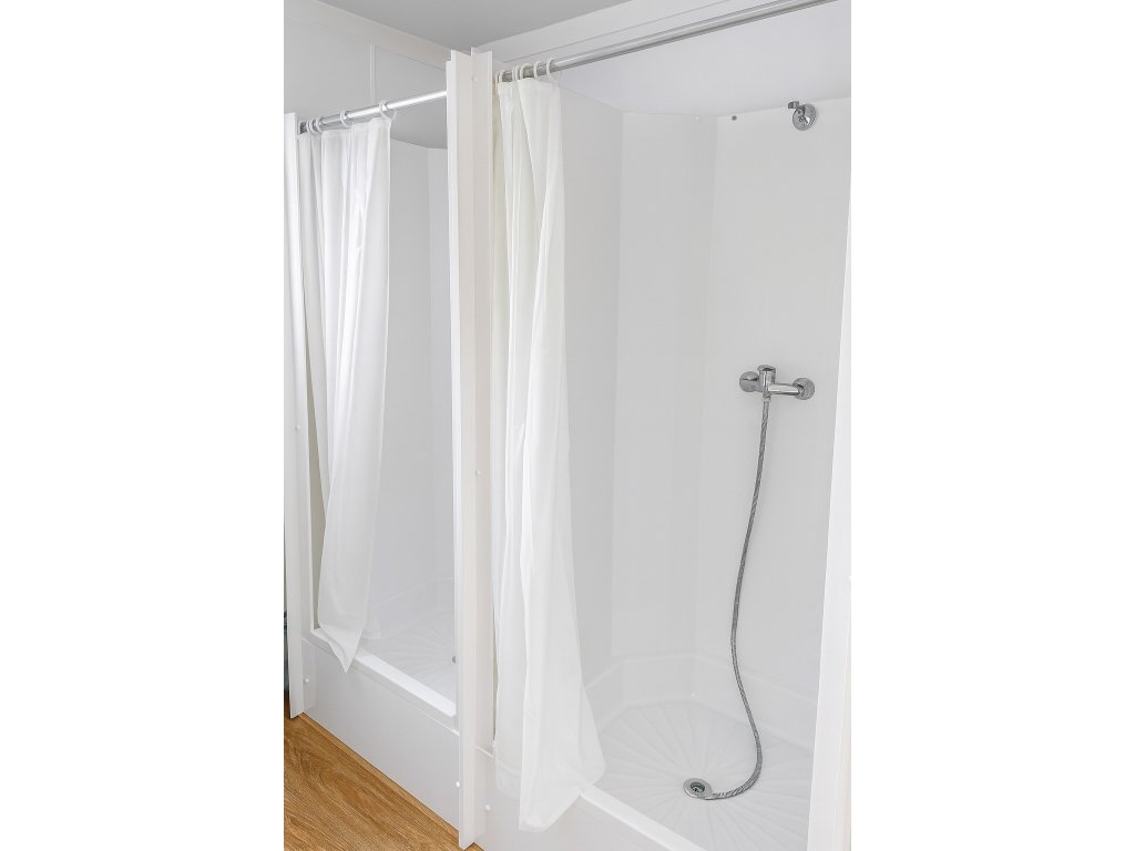 Vnitřní prostor je rozdělen příčkou na část se sprchovým koutem a část s WC a umyvadlem. Součástí výbavy je také elektrický bojler pro ohřev vody.