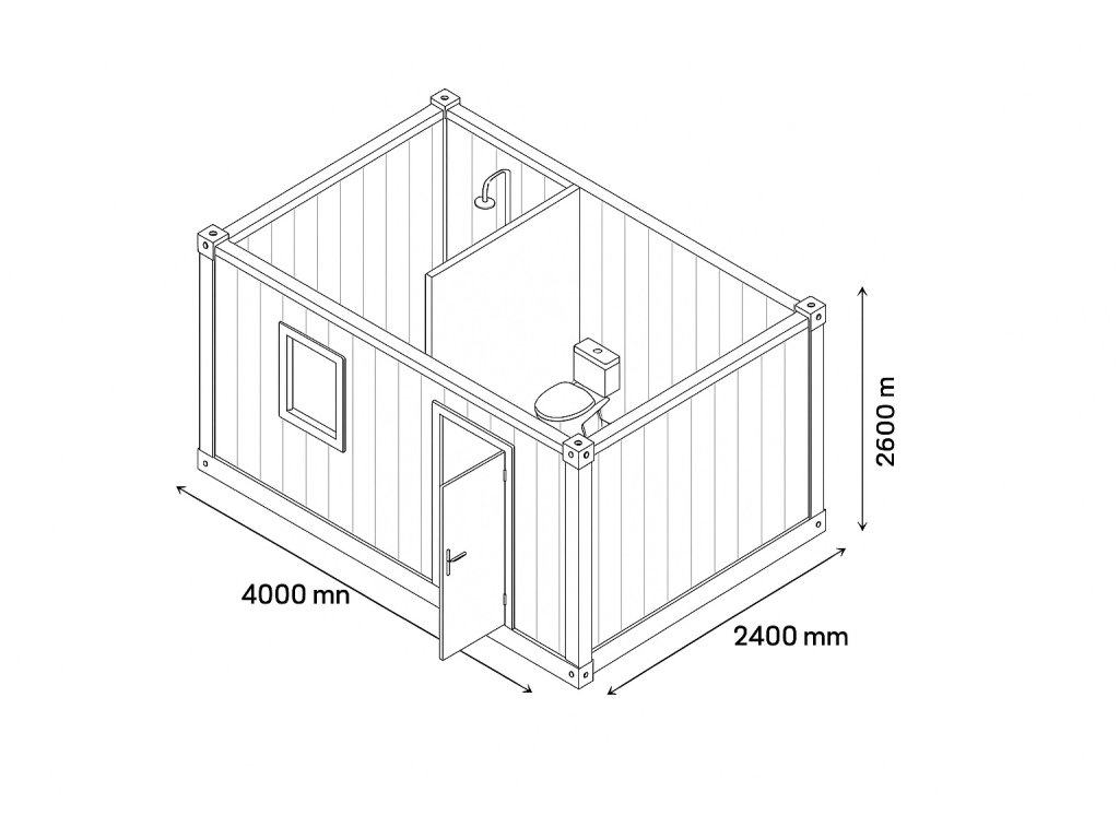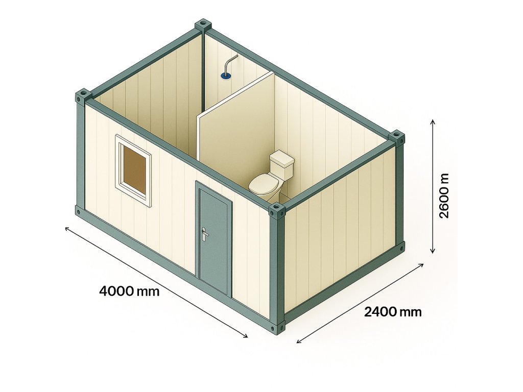 Sanitární kontejner Elado o rozměrech 4 000 × 2 400 mm nabízí plnohodnotné hygienické zázemí v kompaktním provedení.