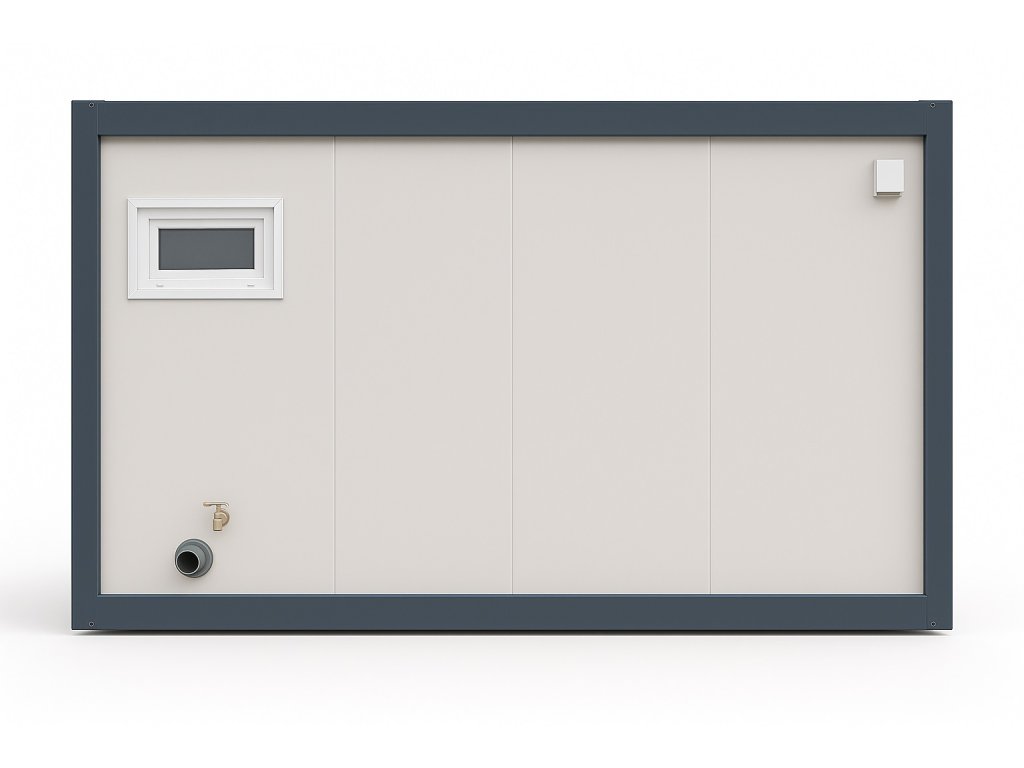 Konstrukce kontejneru je tvořena ocelovým rámem v odstínu RAL 7016 (antracit) a sendvičovými panely RAL 9002 (šedobílá), které zajišťují vysokou tepelnou izolaci a dlouhou životnost. Podlaha je opatřena voděodolnou krytinou v příjemném dřevodekoru, stěny i strop jsou hladké, snadno omyvatelné a vhodné pro pravidelnou údržbu. Tento model lze dodat jako samostatnou jednotku nebo součást větší modulární sestavy (např. společně s obytným či kancelářským kontejnerem).