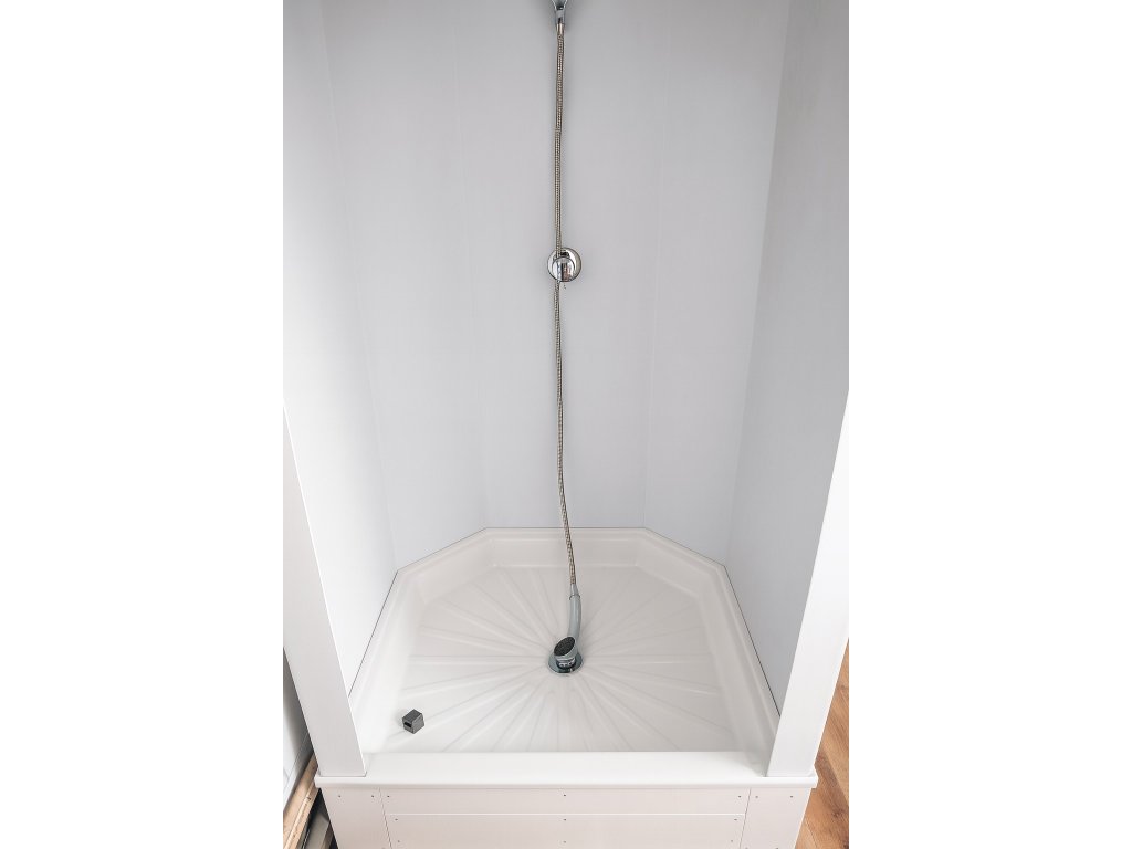 Sanitární kontejner 6 × 2,4 m s vnitřní příčkou. V zadní části koupelna se sprchovým boxem, WC, umyvadlem a bojlerem, přední místnost může sloužit jako kancelář nebo šatna.